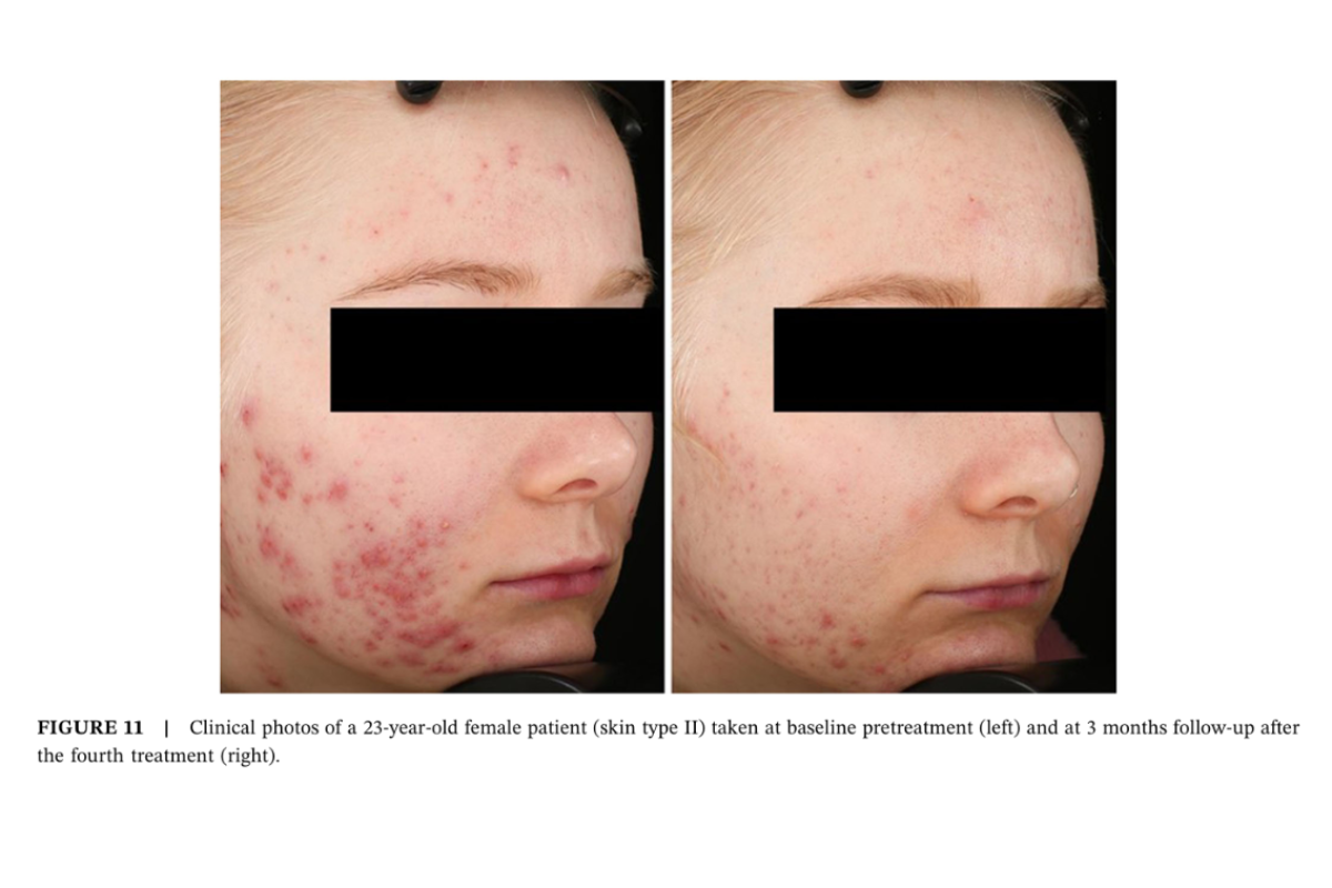 Short-term inflammatory lesion reduction: ~71–82% median/average reduction in inflammatory lesion counts at ~12 weeks after the treatment course in reported studies. (Lasers Surg Med 2025 Mar; 57(3):236-251)
